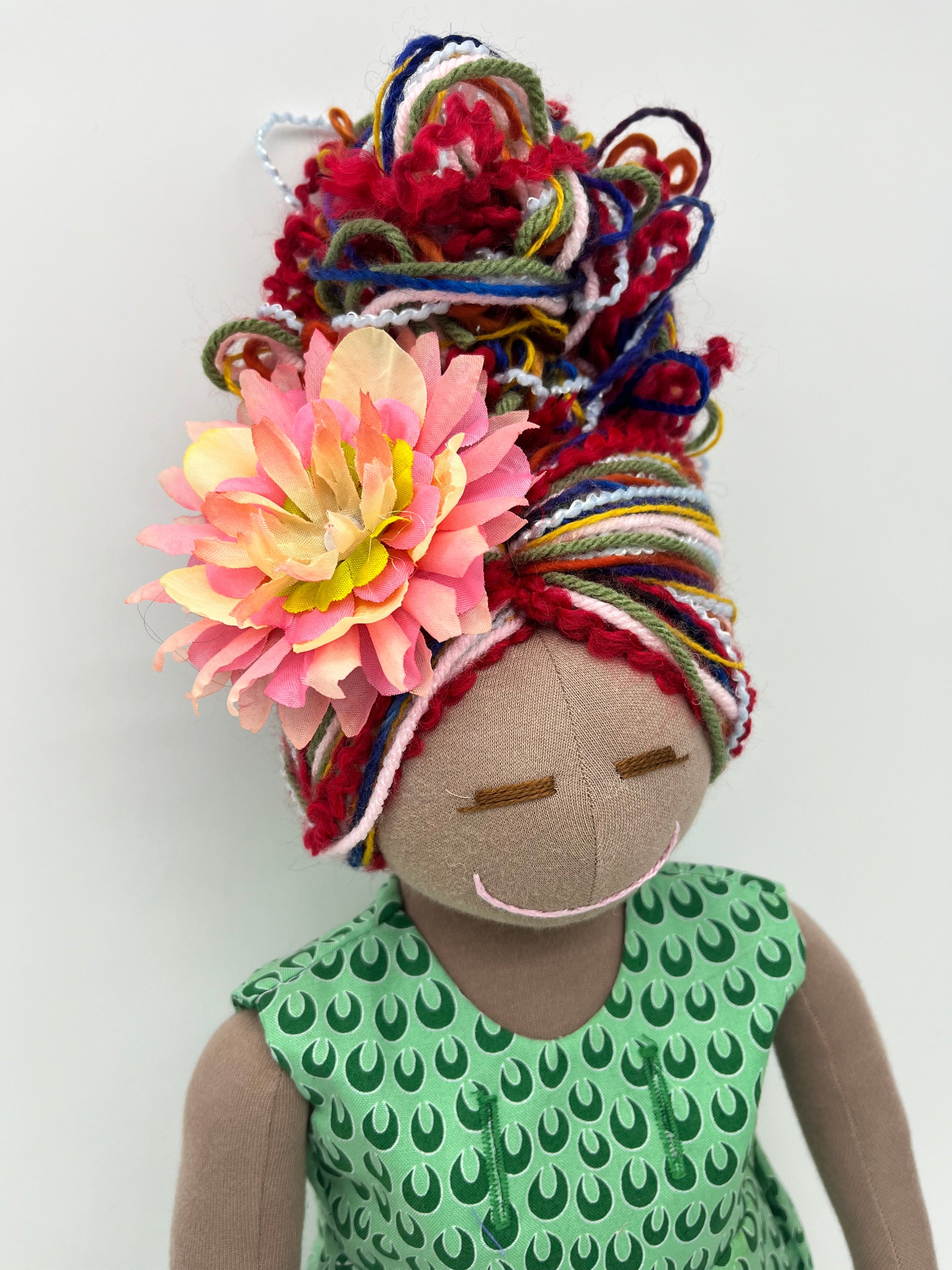 Crafted with lots of care, this exceptional doll is made from premium quality cotton interlock, providing a soft and comforting touch. It is filled with light fiberfill for an irresistible huggable feel. The doll's beautiful hair is meticulously crafted using a combination of luxurious merino wool and other high-quality yarns.