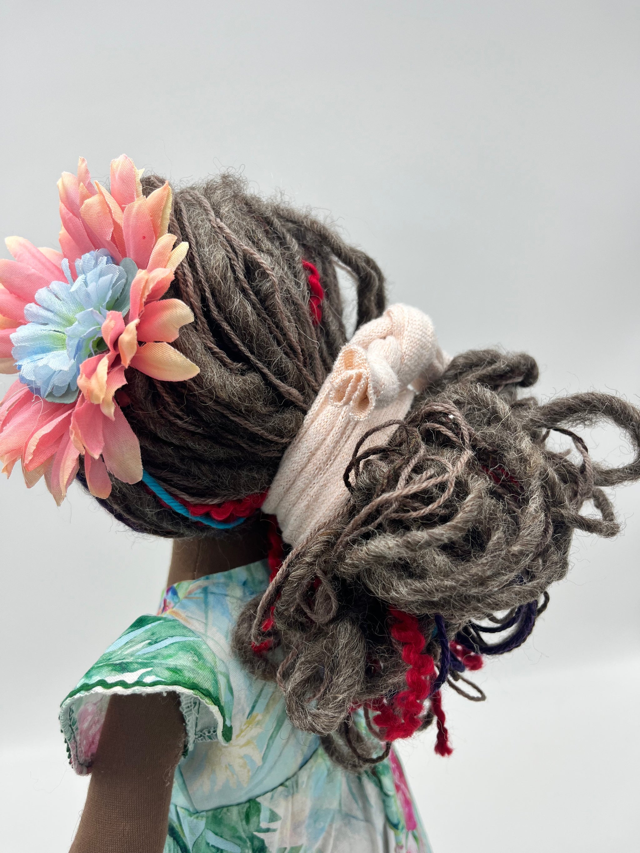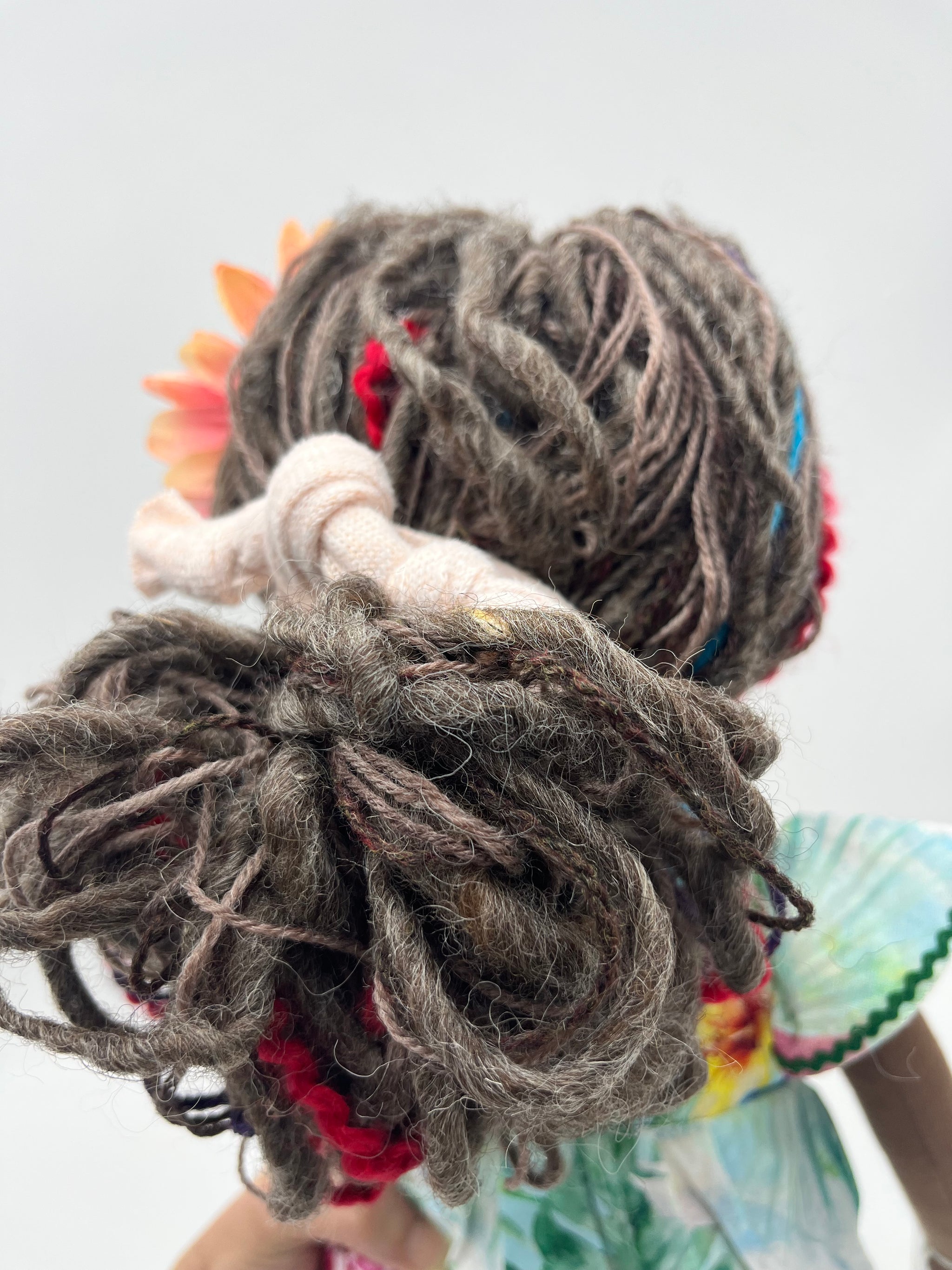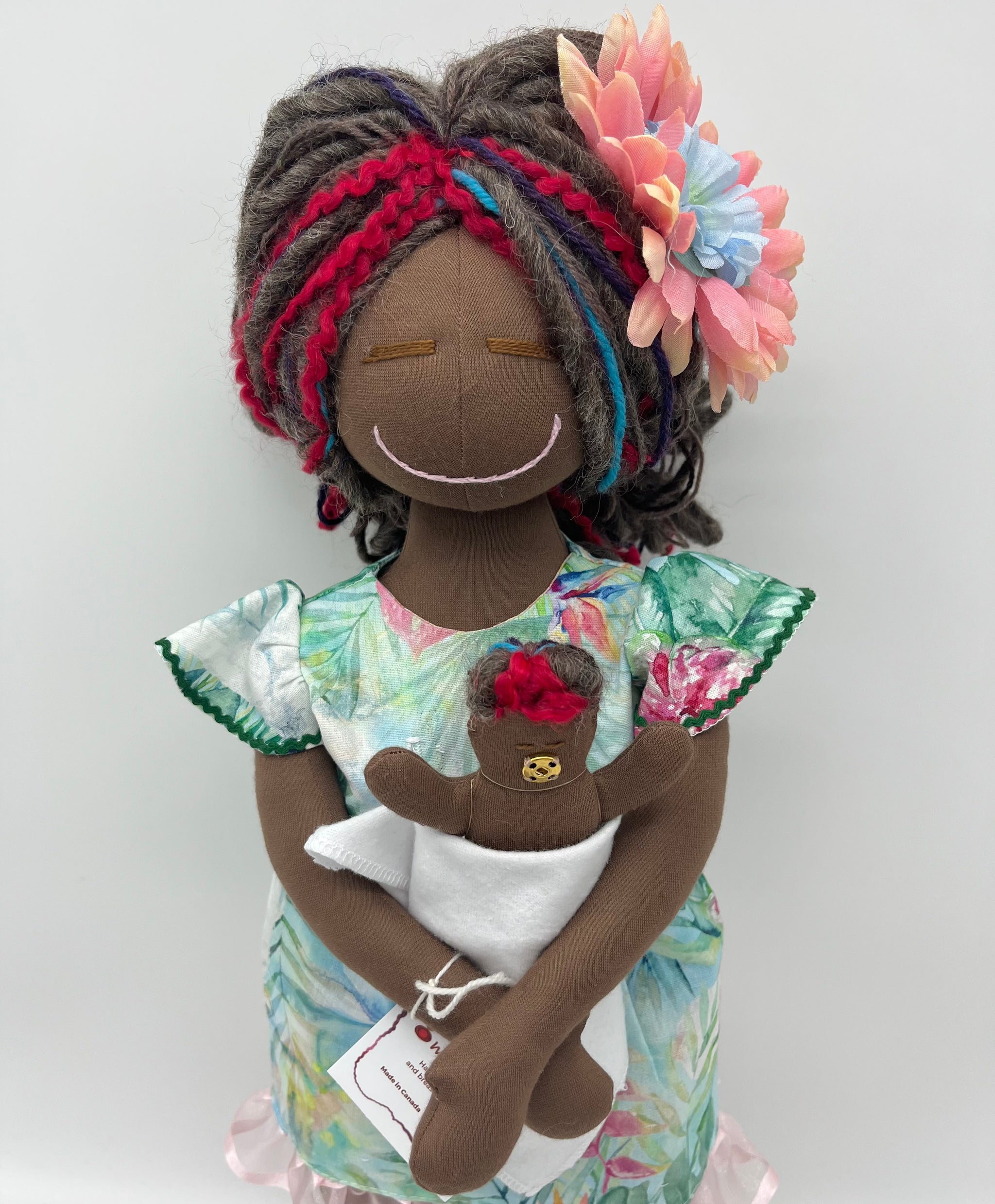 This doll was made using premium quality cotton interlock, and was filled with soft and light fiberfill. The hair is a mix of merino wool and other quality yarns.